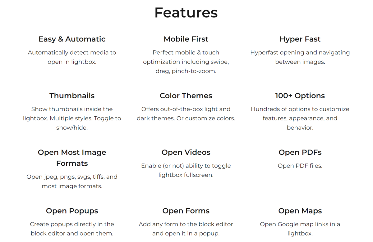 - Jest prosty w użyciu i zautomatyzowany. Manipulowanie ustawieniami lub kodem może wymagać czasu i wysiłku, którego możesz nie mieć. Wtyczka automatycznie rozpoznaje Twoje multimedia — zdjęcia, dynamiczne galerie, filmy czy pliki PDF — i wyświetla je w przyciągającym wzrok lightboxie. Wszystko, co musisz zrobić, to aktywować wtyczkę.