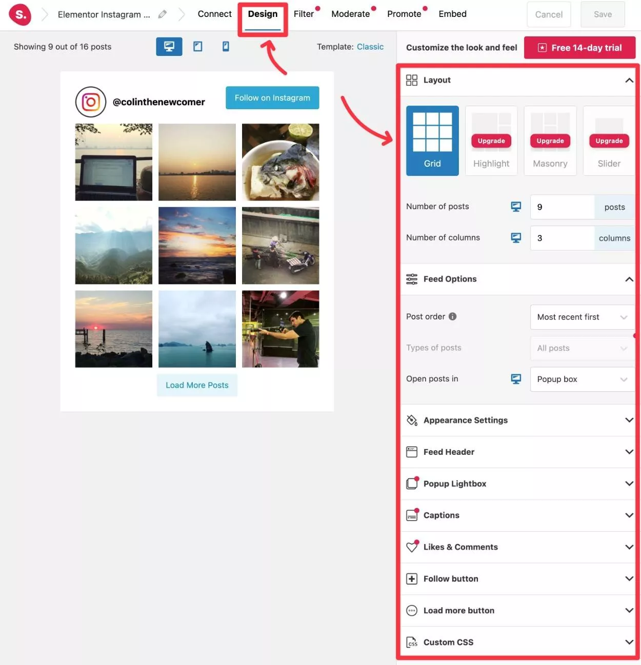 Ten widżet nie tylko pozwala zobaczyć podgląd na żywo w edytorze Elementor, ale także pozwala dostosowywać (i tworzyć) kanały na Instagramie bezpośrednio z interfejsu Elementora.