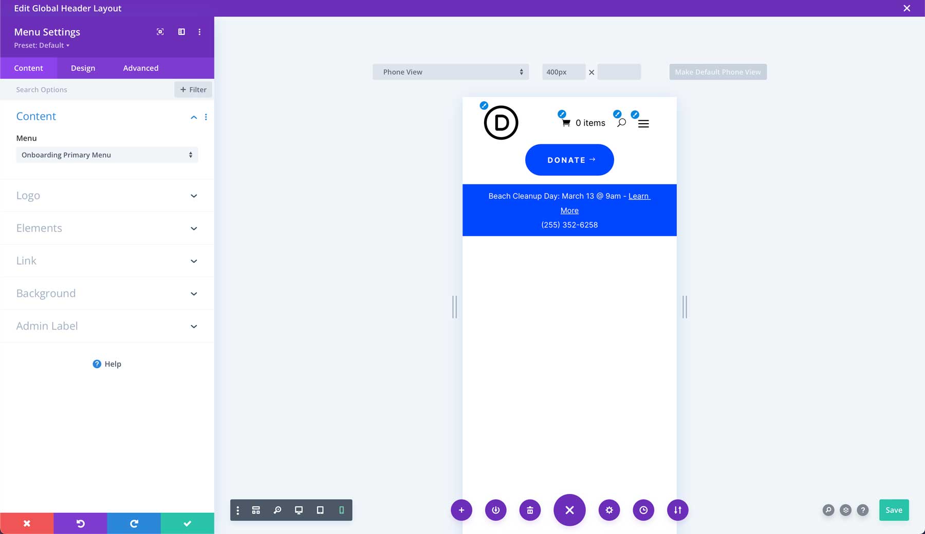 Po otwarciu szablonu możesz edytować kolor tła nagłówka, dodać logo lub dostosować czcionki i kolory w ustawieniach menu za pomocą narzędzia Visual Builder. Dodawaj, usuwaj i stylizuj moduły Divi jak na stronie internetowej.
