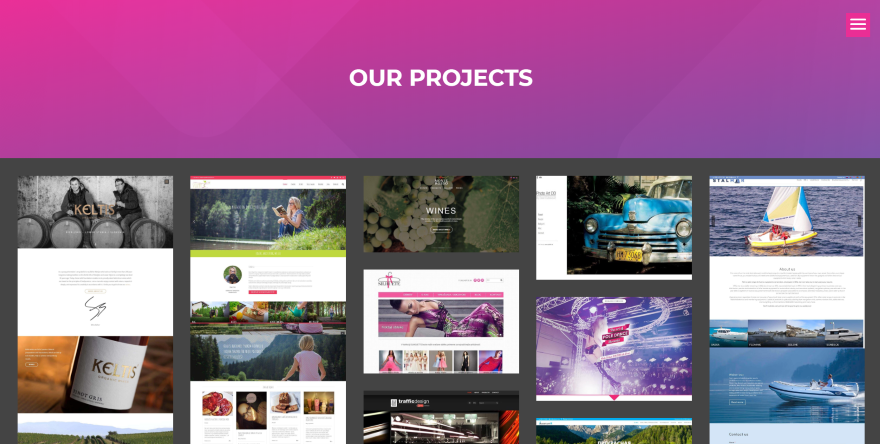 Ta strona portfolio ładuje projekty obrazów podobnych do Pinteresta. Są wyświetlane w siatce 4 lub 5 kolumn (w zależności od rozmiaru ekranu i poziomu powiększenia). Najechanie kursorem na dowolny projekt odsłania lupę. Kliknięcie tego otwiera obraz w lightbox. Wiele obrazów to kompletne układy stron internetowych, podczas gdy inne to obszar bohatera.