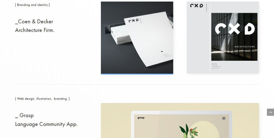 Ta witryna wyświetla listę usług, które otwierają się za pomocą przełączników w sekcji bohatera, po której następuje sekcja o pełnej szerokości, aby wyświetlić cytat. Sekcja portfolio pokazuje kategorie usług, nazwę klienta i opis klienta po lewej stronie oraz zdjęcia projektu po prawej. Każda z pozycji portfela jest oddzielona cienką przegrodą. Przykłady witryn internetowych obejmują łącza do przeglądania witryny na żywo.