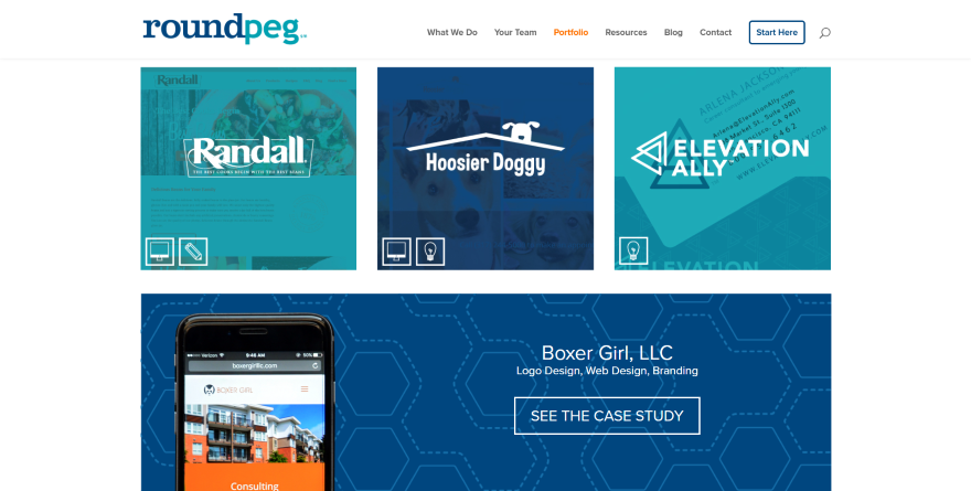 Ta strona portfolio wyświetla obraz o pełnej szerokości z tytułem, sloganem i przyciskiem z interesującą ramką, która pasuje do kolorów marki witryny. Przewijanie ujawnia przefiltrowane portfolio w trzykolumnowej siatce. Portfolio przedstawia logo klienta w kolorze monochromatycznym, które wyświetla się w kolorze po najechaniu kursorem. Zawierają również nazwę klienta i świadczone usługi. Wiersz po lewej stronie wyświetla nazwy sieci społecznościowych w tekście zorientowanym bokiem. Pozostają na ekranie podczas przewijania.