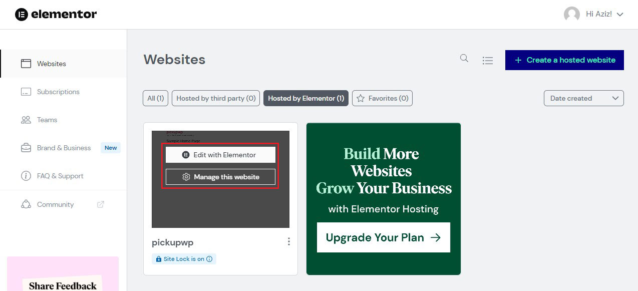 Na panelu kontrolnym Elementora zobaczysz nową witrynę internetową w opcji Hostowane przez Elementor .