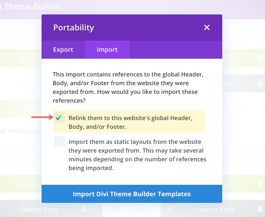 Aby to zrobić, upewnij się, że podczas importowania szablonu wybrałeś opcję „Połącz je ponownie z globalnym nagłówkiem, treścią i/lub stopką tej witryny”.
