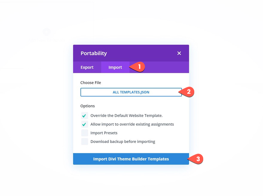 W większości przypadków zalecamy przetestowanie tych nowych pakietów Theme Builder Pack na stronie testowej lub tymczasowej, aby można było zaimportować wszystkie szablony naraz, nie martwiąc się o zastępowanie istniejących szablonów lub ingerowanie w bieżący projekt działającej witryny. Jeśli jednak chcesz zaimportować nowe szablony Theme Buildera do działającej witryny z istniejącymi szablonami, musisz zapoznać się z dostępnymi opcjami.