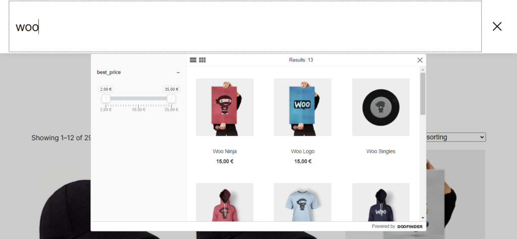 Doofinder zoptymalizuje teraz wyszukiwanie na podstawie danych produktu, a także utworzy warstwę wyszukiwania natychmiastowego w Twojej witrynie w miejscu domyślnego wyszukiwania WooCommerce.
