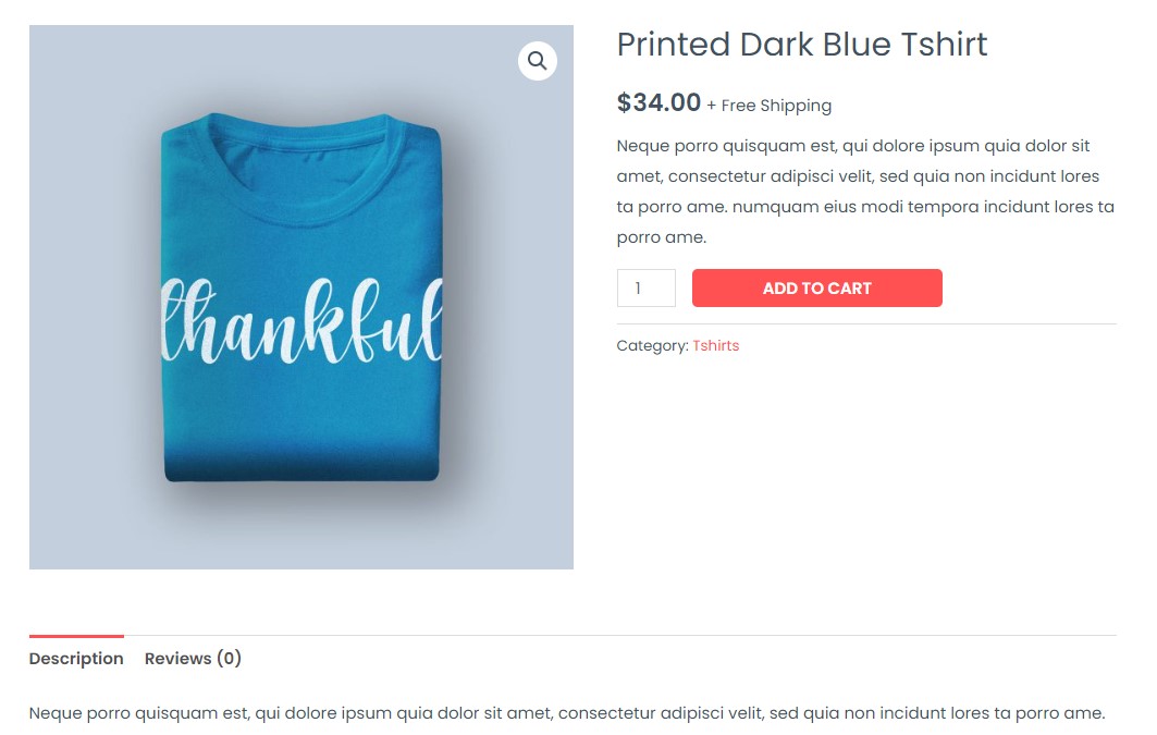 Po zakończeniu podstawowych ustawień WooCommerce nadszedł czas na dodanie produktów. Motyw witryny Astra, który wybraliśmy w tym samouczku, zawiera już przykładowe produkty i tak wygląda strona produktu na froncie: