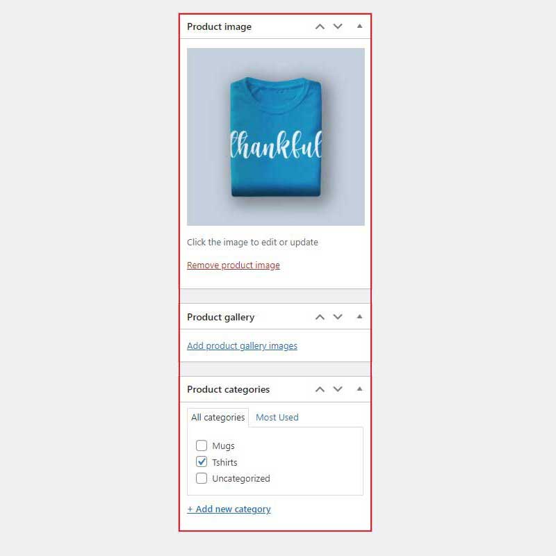 Na prawym pasku bocznym możesz wybrać Zdjęcie produktu i Kategorie produktów . Jeśli masz więcej zdjęć produktów, możesz je dodać w sekcji Galeria produktów .