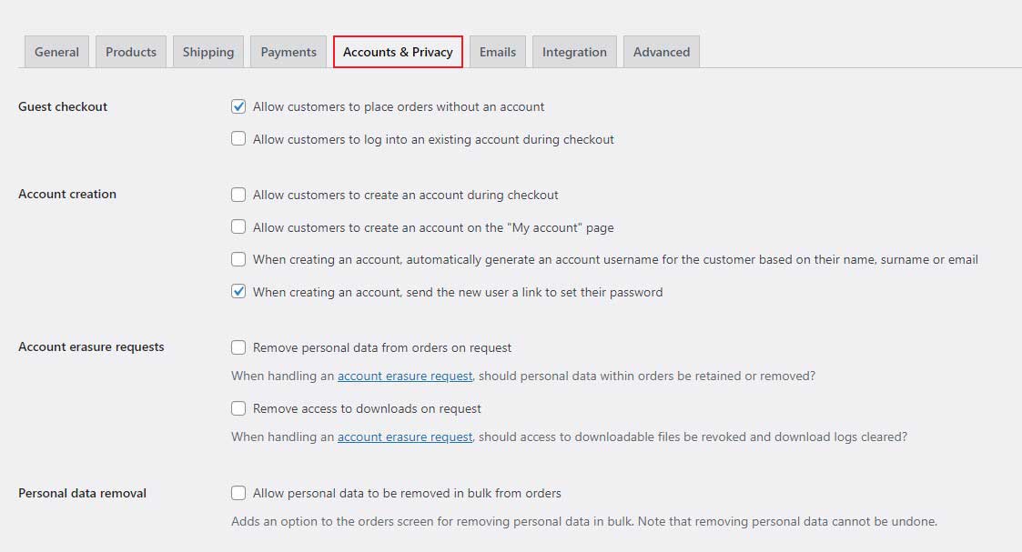 Ta zakładka pozwala skonfigurować ustawienia dotyczące tworzenia konta i prywatności użytkownika. Możesz zdecydować, czy zezwolić klientom na dokonywanie zakupów bez tworzenia konta, dostosować strony dotyczące prywatności i polityki oraz zdecydować, jak długo będą przechowywane dane użytkownika.