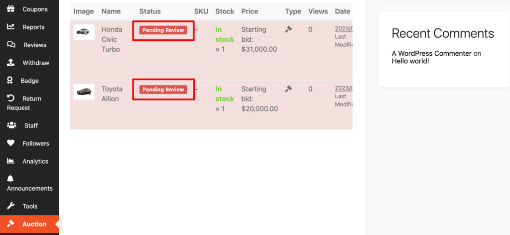 Po dodaniu kilku produktów, jeśli odwiedzisz swoją listę produktów, zobaczysz, że wszystkie dodane przez Ciebie produkty nadal mają etykiety oczekujące na sprawdzenie . Oznacza to, że ktoś musi zatwierdzić Twoje produkty. W tym przypadku tym kimś jesteś ty. Ponieważ to Twój rynek, a Ty jesteś administratorem.