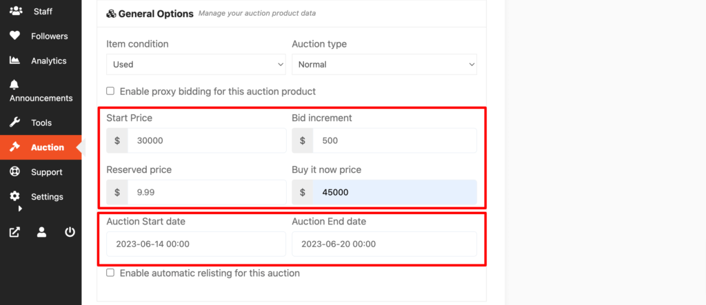 Cena początkowa: Jest to cena minimalna. Więc licytacja rozpocznie się tutaj. Jakbyś ustalił 30 000 $ jako cenę początkową. Tak więc licytacja rozpocznie się od 30 000 USD i będzie rosła za każdym razem, gdy klienci złożą ofertę.