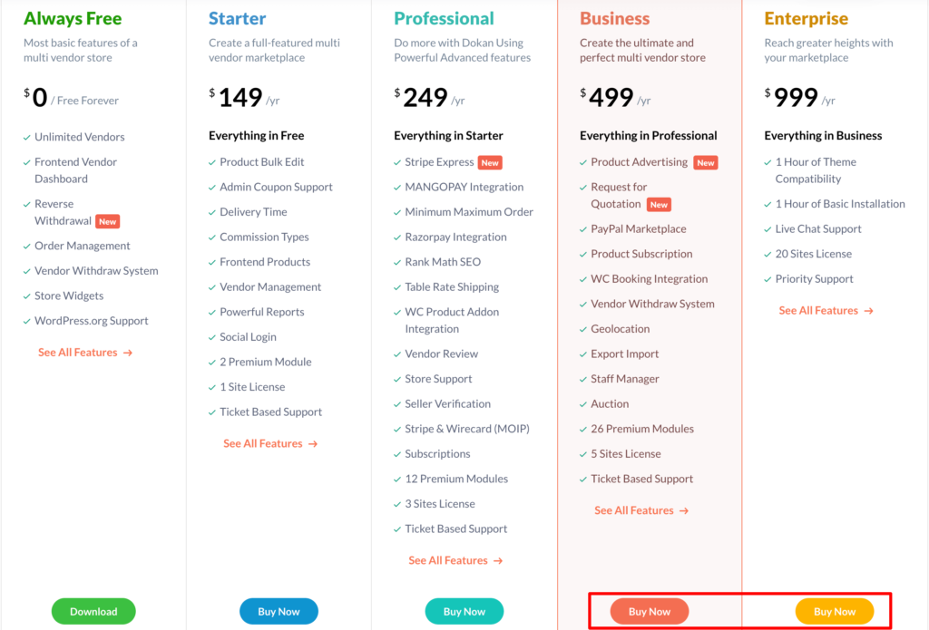 Aby utworzyć rynek aukcyjny, potrzebujesz modułu premium o nazwie moduł Dokan Simple Auction. Moduł ten jest zawarty w pakietach Dokan Business i Dokan Enterprise. Aby uzyskać dostęp do tego modułu, musisz kupić pakiety Dokan Business lub Dokan Enterprise. Sprawdźmy, jak kupić wersję premium Dokan i zainstalować ją na swojej stronie.