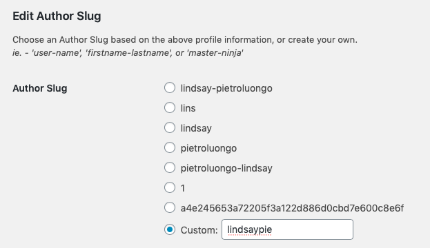 Po zainstalowaniu i aktywacji wtyczki przejdź do ustawień użytkownika. Przewiń w dół, aż zobaczysz sekcję „Edytuj ślimak autora”. Masz kilka opcji, w tym tworzenie niestandardowego ślimaka, którego użyłem poniżej.