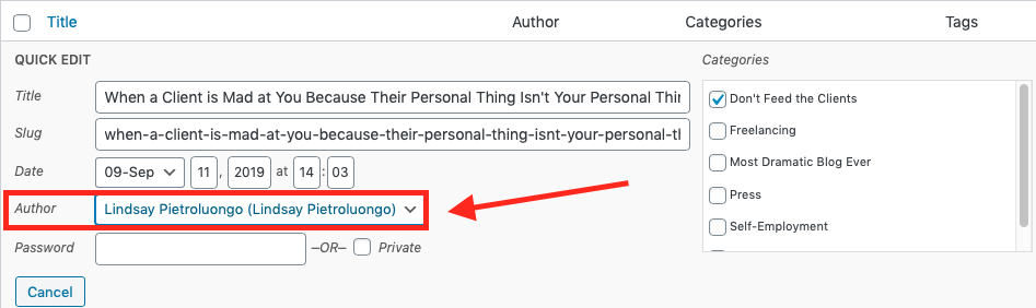 Niezależnie od tego, czy używasz edytora bloków, czy klasycznego edytora, możesz również zmienić autora za pomocą „Szybkiej edycji”.