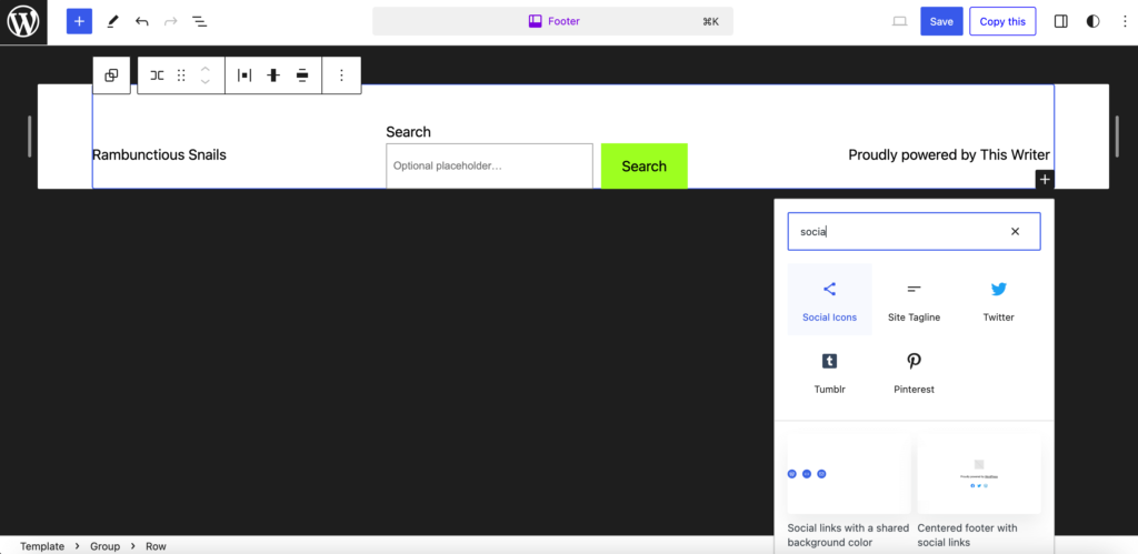 W edytorze bloków znajdź sekcję stopki. Kliknij ikonę „+”, aby otworzyć listę widżetów i wpisz Ikony społecznościowe .