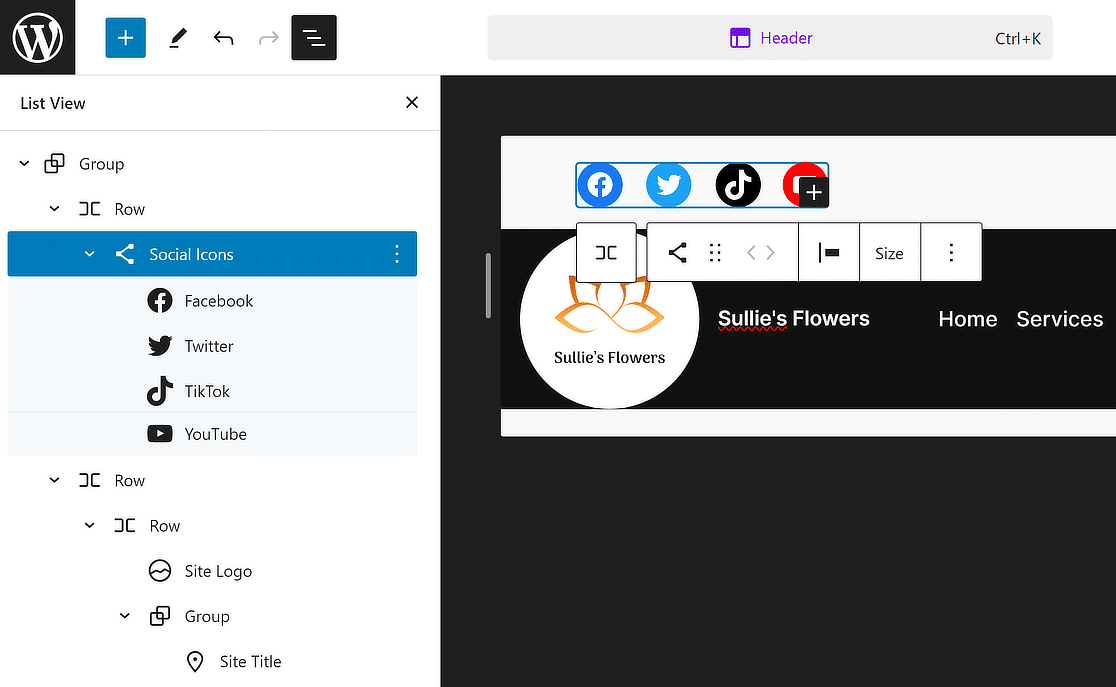 Gdy znajdziesz się w Edytorze bloków nagłówka swojej witryny, kliknij ikonę Widok listy , aby łatwo było dowiedzieć się, jakie elementy znajdują się w nagłówku WordPress.