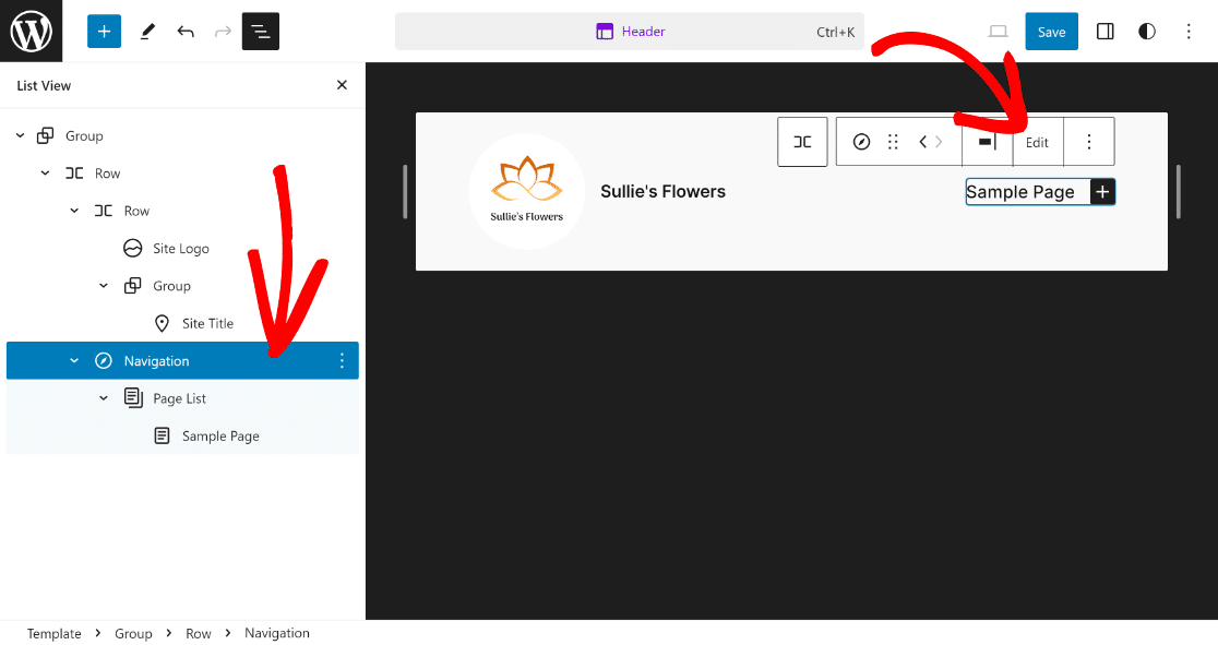 Aby dodać strony do nagłówka, po prostu kliknij opcję Nawigacja w widoku listy , a następnie kliknij opcję Edytuj dla jej bloku.