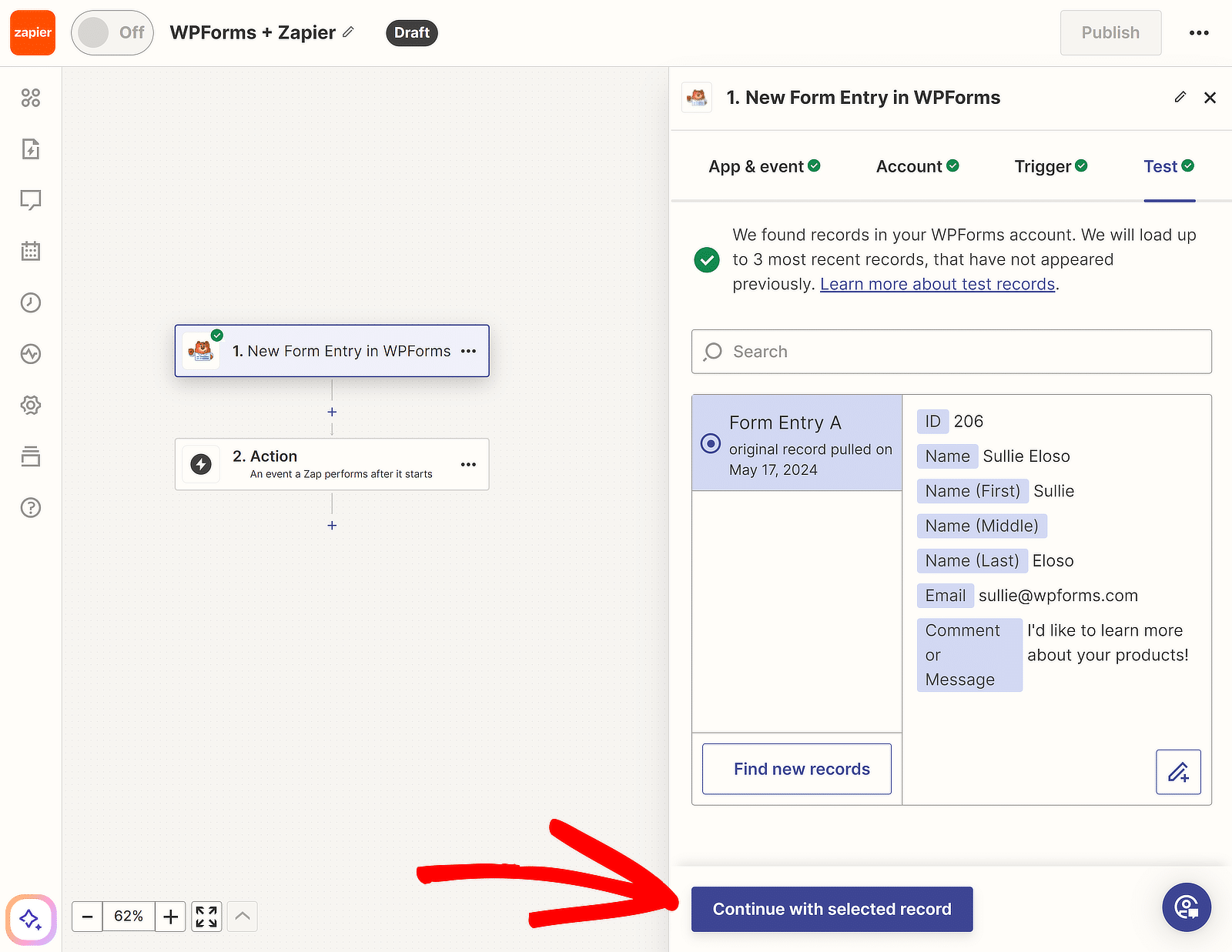Możesz teraz przetestować połączenie pomiędzy formularzem a Zapierem. Przed kliknięciem przycisku wyzwalacza testu prześlij co najmniej jeden wpis testowy do formularza.