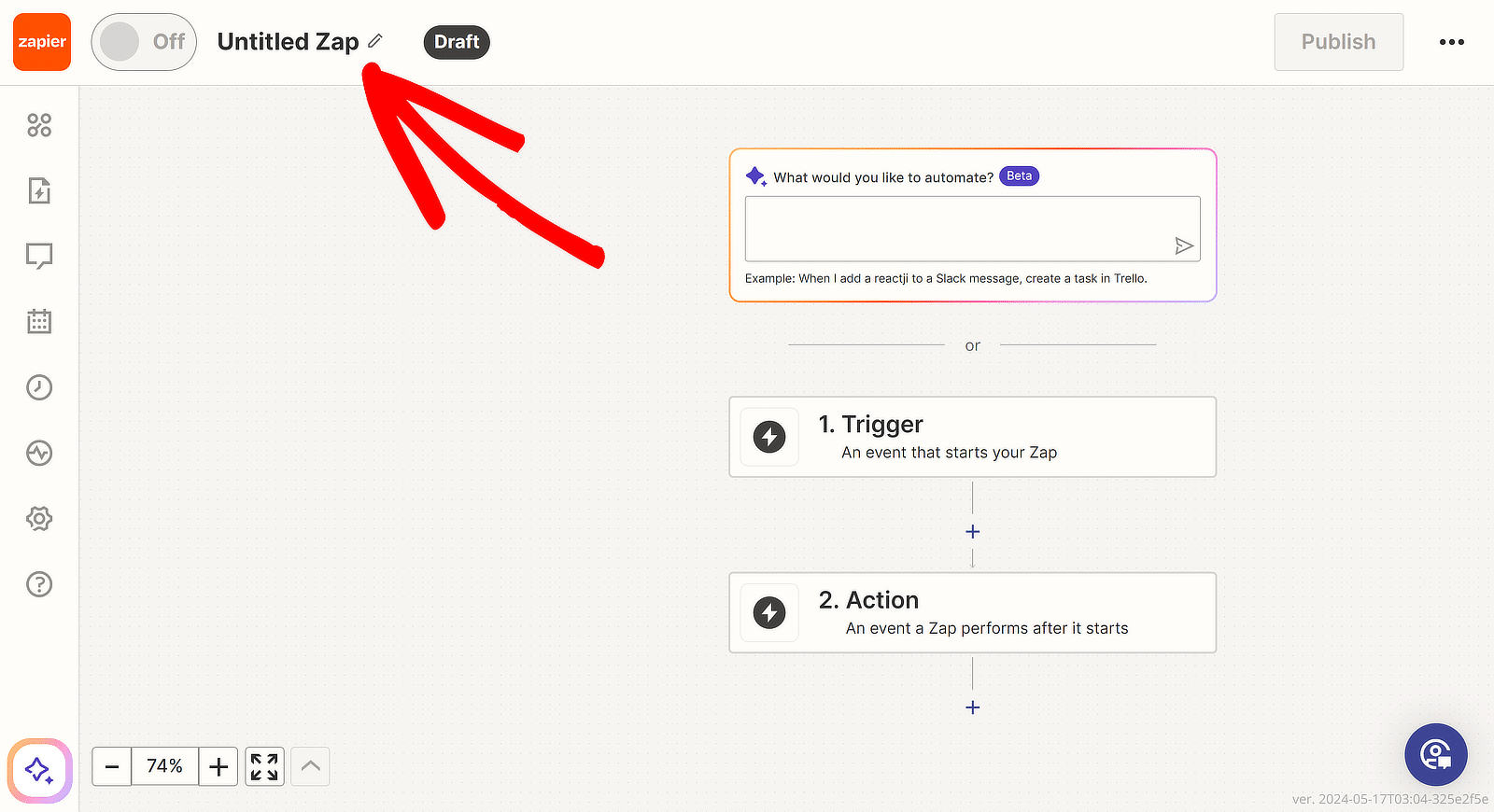 Spowoduje to otwarcie strony konfiguracji Zap. Możesz zmienić nazwę swojego Zapa, klikając Zap bez tytułu w lewym górnym rogu.