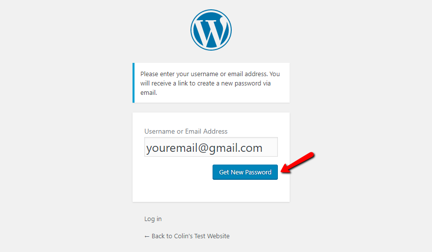 Daj temu klik. Następnie na następnym ekranie wprowadź swoją nazwę użytkownika WordPress lub adres e-mail powiązany z kontem WordPress i kliknij opcję Uzyskaj nowe hasło :