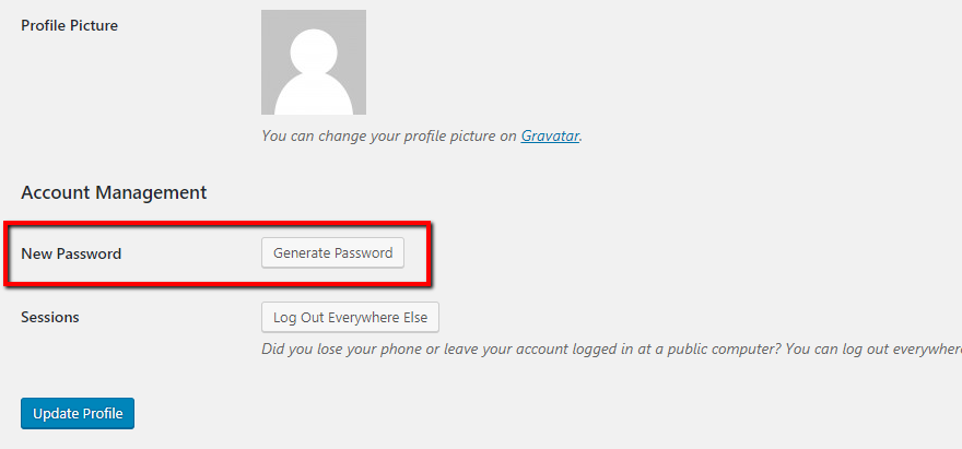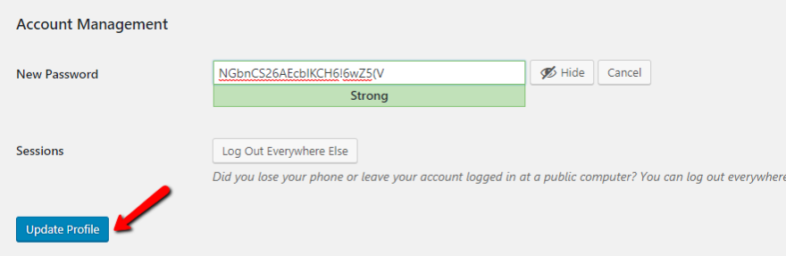Po zakończeniu kliknij przycisk Aktualizuj profil . Następnie możesz zalogować się do WordPress za pomocą nowego hasła.