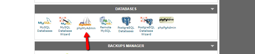 Zakładając, że używasz hosta z cPanel (który jest obecnie najtańszym hostem), możesz uzyskać dostęp do phpMyAdmin, szukając przycisku phpMyAdmin na pulpicie nawigacyjnym cPanel: