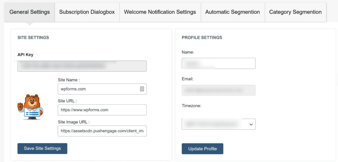 Twoja witryna WordPress jest teraz połączona z PushEngage i zobaczysz teraz domyślną stronę Ustawienia ogólne PushEngage.