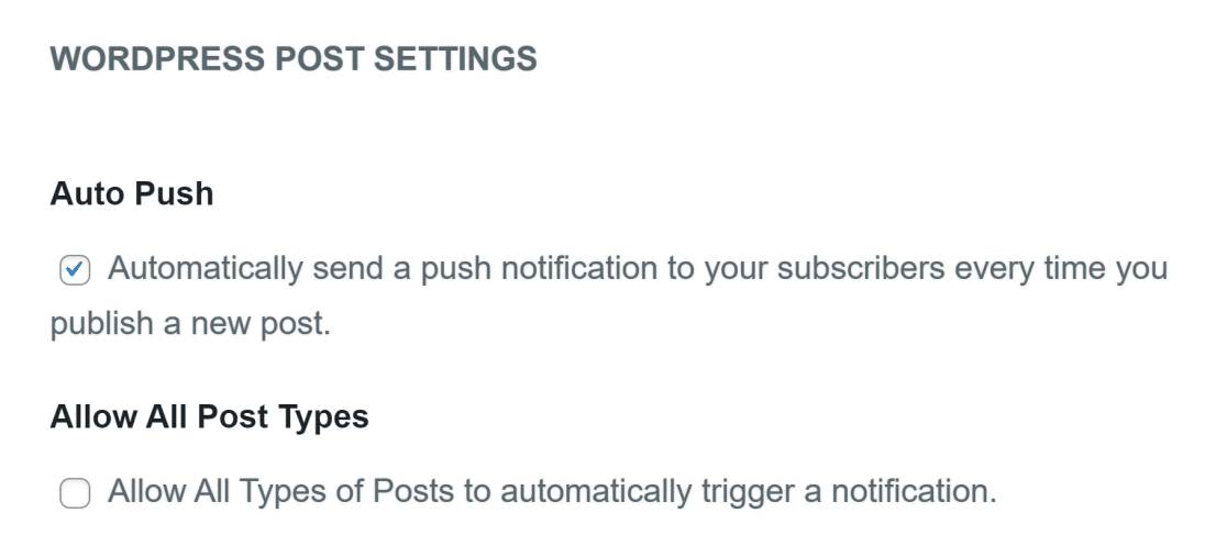 Tutaj możesz uzyskać dostęp do kilku bardzo przydatnych opcji. Na przykład, jeśli przewiniesz w dół do sekcji Ustawienia posta WordPress , możesz ustawić PushEngage, aby automatycznie wysyłał powiadomienie za każdym razem, gdy opublikujesz nowy post.