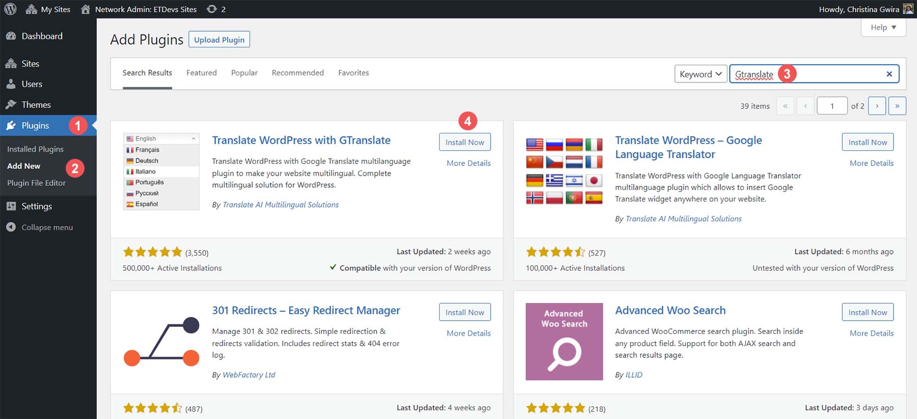 Zaczynamy od zainstalowania wtyczki GTranslate. Najedź kursorem na pozycję menu Wtyczki . Następnie kliknij Dodaj nowy . Następnie wyszukaj GTranslate w polu wyszukiwania wtyczek. Na koniec kliknij Zainstaluj teraz , a następnie Aktywuj, aby zakończyć instalację tej wtyczki.