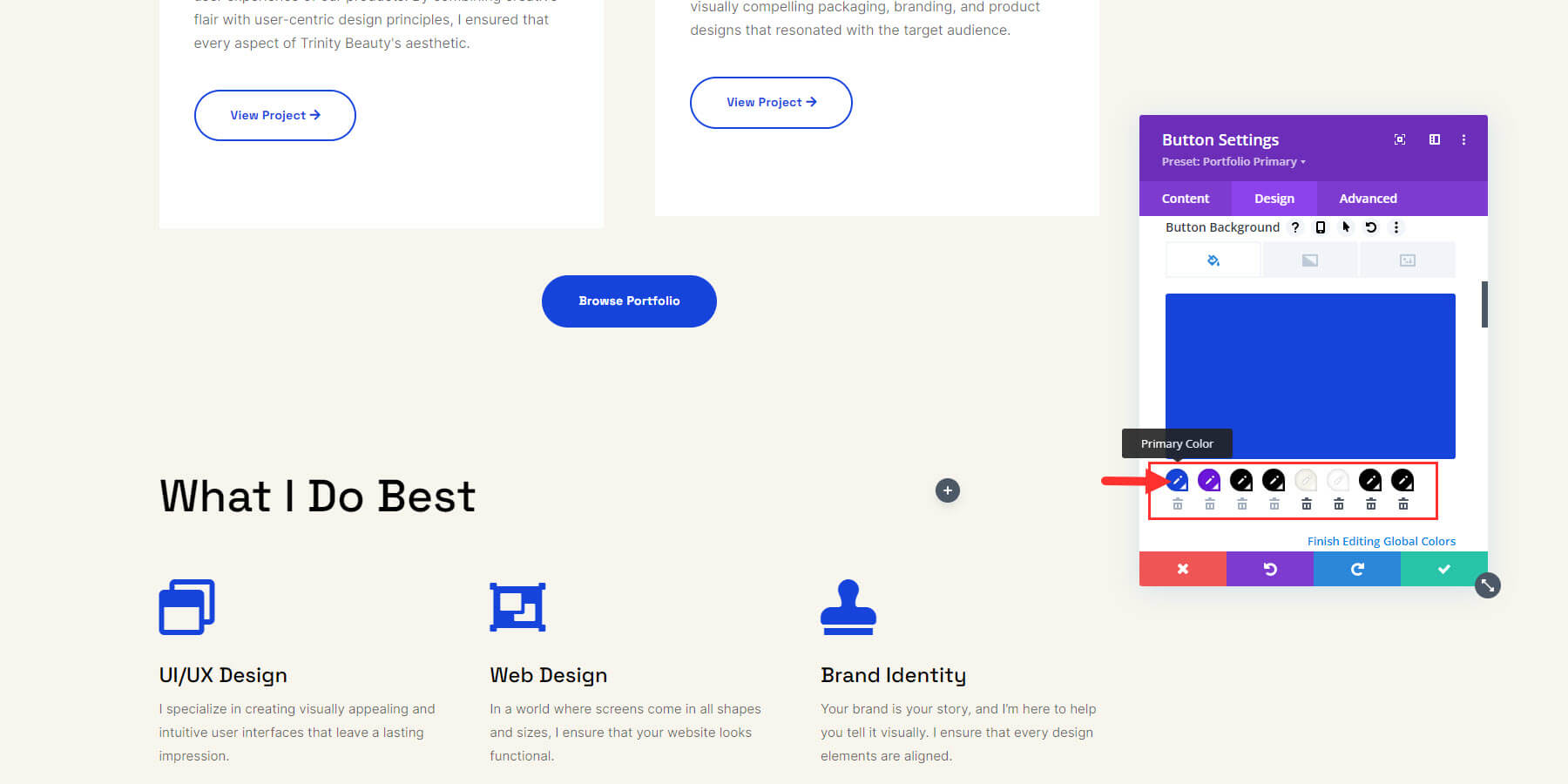 Dostęp do kolorów globalnych można uzyskać z ustawień dowolnego modułu zawierającego opcję koloru. Na przykład kliknij, aby edytować moduł przycisku, znajdź opcję koloru tła przycisku na karcie projektu. Zobaczysz rząd zapisanych kolorów. Wybierz przycisk przełączania „globalny”, aby wyświetlić wszystkie globalne kolory witryny. Następnie wybierz ikonę koła zębatego, aby edytować kolory globalne.