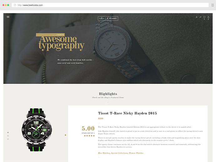 Jest specjalnie zaprojektowany dla sklepów z zegarkami . Ten responsywny motyw zawiera 4 układy strony głównej, zbudowane za pomocą Bootstrap i obsługiwane przez Visual Composer. Ponadto ten niesamowity motyw jest zintegrowany z WooCommerce, wieloma wtyczkami z wieloma funkcjami, szybkim podglądem produktu, niestandardowymi widżetami, nieograniczoną liczbą schematów kolorów, RevoSliderem z płynnymi efektami przejścia, MegaMenu z wieloma stylami kolumn i zaawansowanymi widżetami…