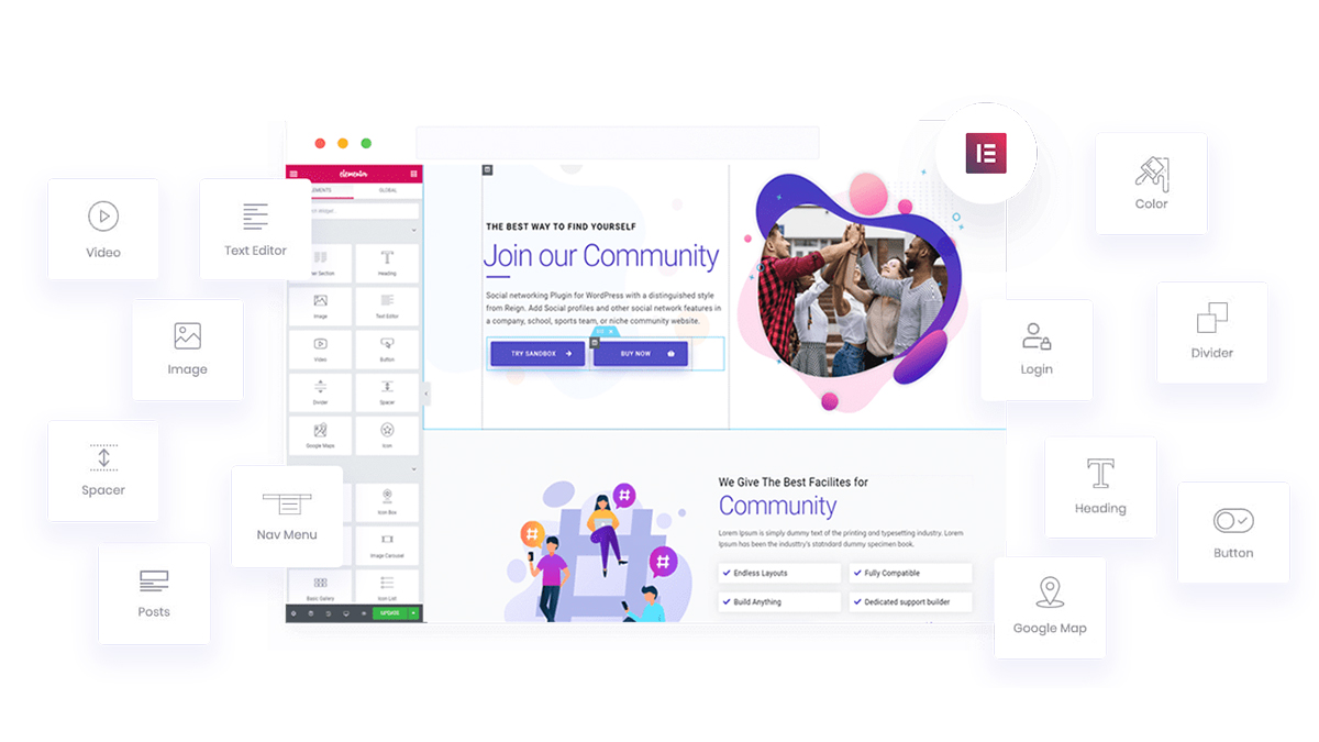 Dzięki zastosowaniu narzędzia Customizer wprowadzanie globalnych zmian w witrynie jest łatwe. Jeśli jednak chcesz mieć większą kontrolę nad projektowaniem poszczególnych elementów treści w swojej witrynie, będziesz musiał użyć narzędzia do tworzenia stron. Na szczęście Reign został zbudowany wokół Elementora, jednej z najlepszych dostępnych obecnie wtyczek do tworzenia stron WordPress. Aby umożliwić projektowanie witryny za pomocą łatwych opcji przeciągania i upuszczania, motyw Reign BuddyPress obsługuje Kreator stron Elementor. Po prostu przeciągnij i upuść elementy, które chcesz dodać na swoją stronę internetową i zobacz imponujące wyniki w czasie rzeczywistym.