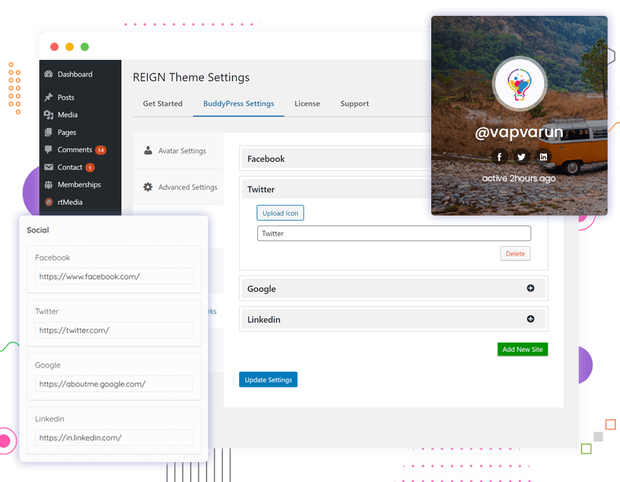 Reign BuddyPress Theme oferuje również wbudowaną obsługę modułu profilu społecznościowego. Możesz po prostu dodać platformy, na które mają być wyświetlane Twoi członkowie. Wszystkie dodane platformy pojawią się na górze konkretnego nagłówka członka.