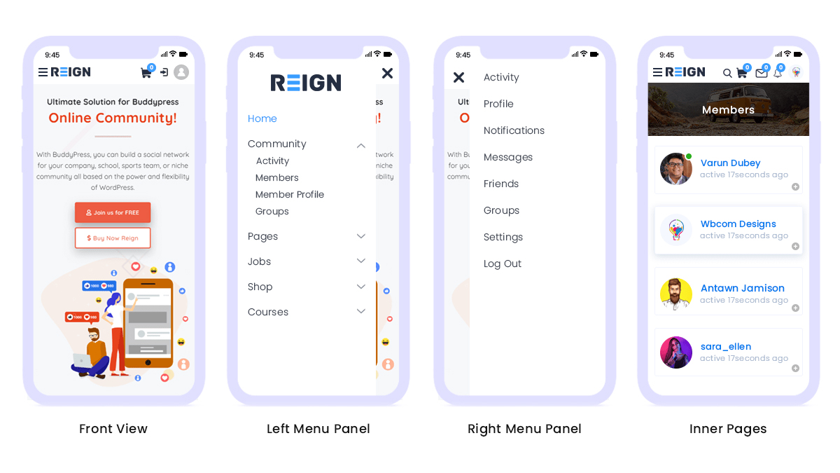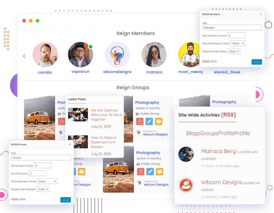 Będąc motywem dedykowanym BuddyPress, Reign jest również wyposażony w 4 dedykowane widżety, które można wyświetlać w Strumieniu Aktywności, Katalogu członków, Katalogu grup, Pojedyncza strona członka i Pojedyncza strona grupy.