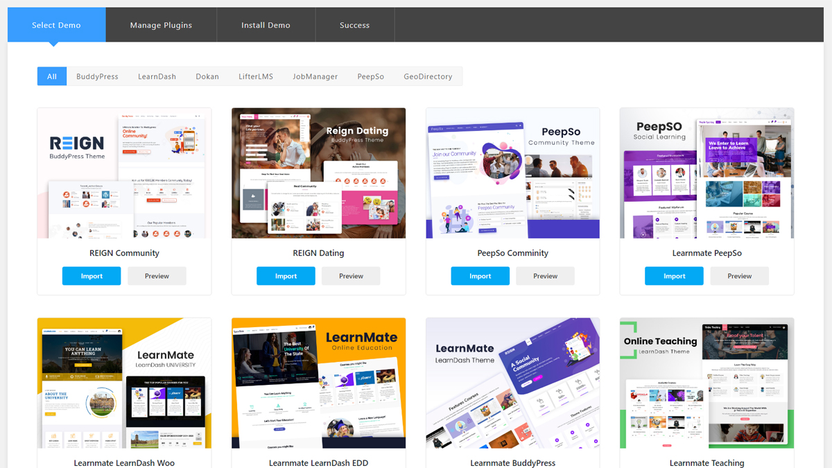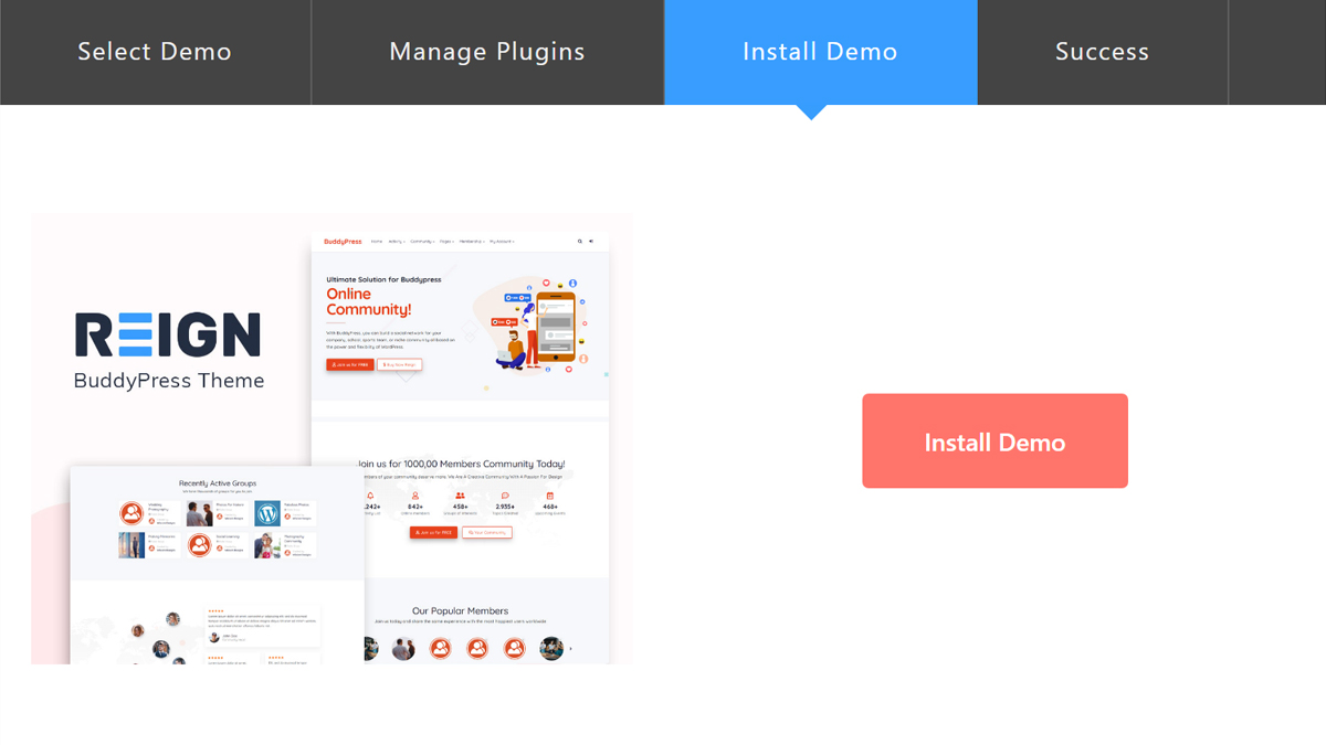Motyw Reign WordPress BuddyPress zapewnia dostęp do wielu wersji demonstracyjnych, które możesz zaimportować w ciągu kilku minut za pomocą zaledwie kilku kliknięć. Po zakończeniu importowania treści demonstracyjnych będziesz mieć do dyspozycji replikę wersji demonstracyjnej witryny Reign.