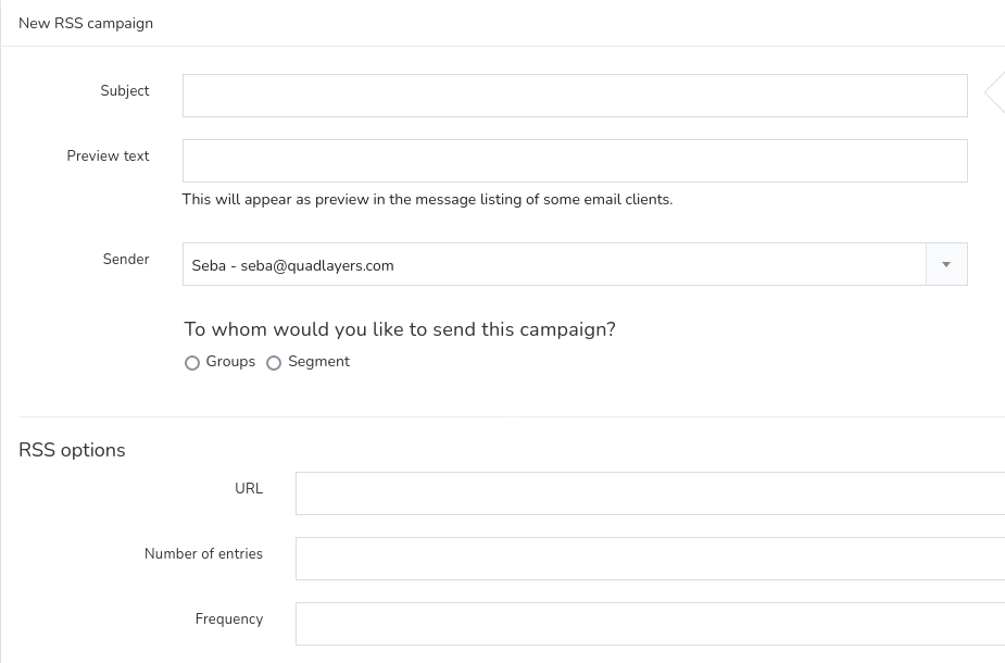 Na następnym ekranie naciśnij Utwórz kampanię i wypełnij formularz odpowiednimi ustawieniami, które zdefiniują Twój feed. Obejmują one temat, tekst podglądu, nadawcę, grupę lub segment, adres URL, liczbę wpisów i częstotliwość.