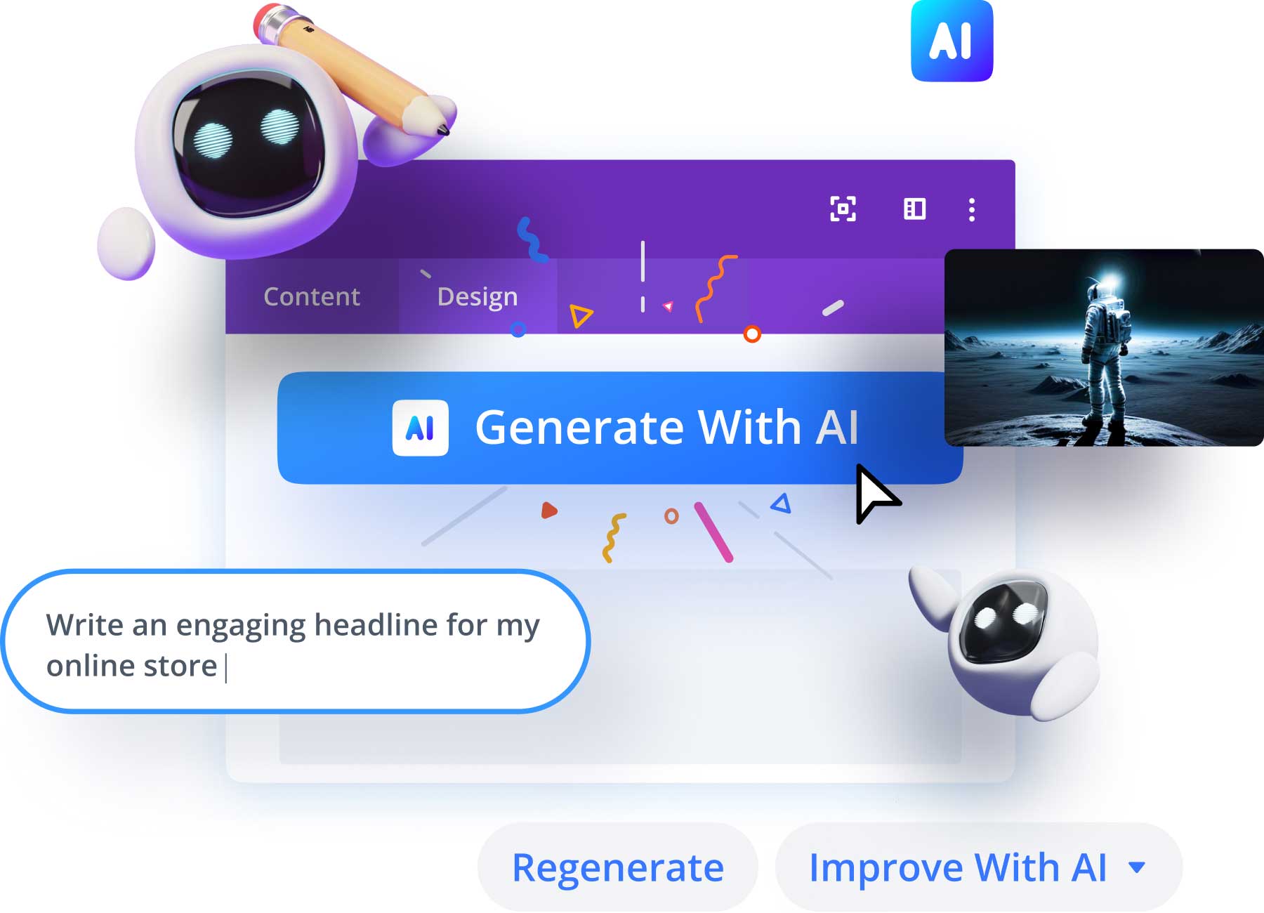 Divi AI to Twój osobisty asystent AI do tworzenia stron internetowych WordPress. Zintegrowany bezpośrednio z kreatorem Divi, Divi AI może pisać wysokiej jakości treści, dostosowywać witrynę za pomocą niestandardowego kodu i generować wspaniałe obrazy na bieżąco podczas tworzenia witryny. To tak, jakby mieć na wyciągnięcie ręki profesjonalnego pisarza, doświadczonego programistę stron internetowych i artystę cyfrowego!