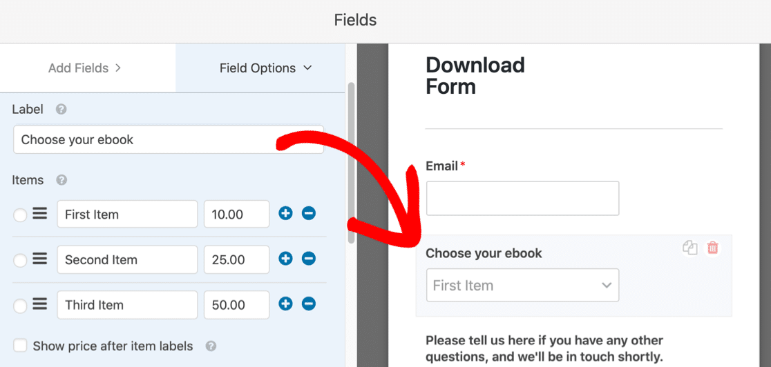 Następnie dodajmy przedmioty, które chcemy sprzedać. Zamierzamy dodać rozwijane pole przedmiotów i sprzedawać 2 różne pliki do pobrania.