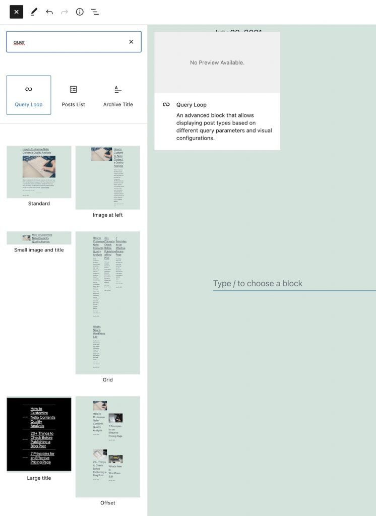 Blok pętli zapytań umożliwia wyświetlanie listy postów, stron lub dowolnego innego niestandardowego typu posta z różnymi stylami i może stosować filtry w zależności od rodzaju wyświetlanej treści.