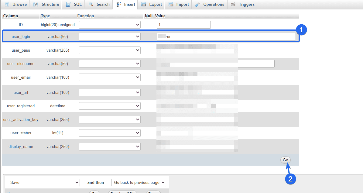 Następnie wprowadź nową nazwę użytkownika w polu „user_login”. Następnie kliknij przycisk Idź , aby zapisać zmiany.