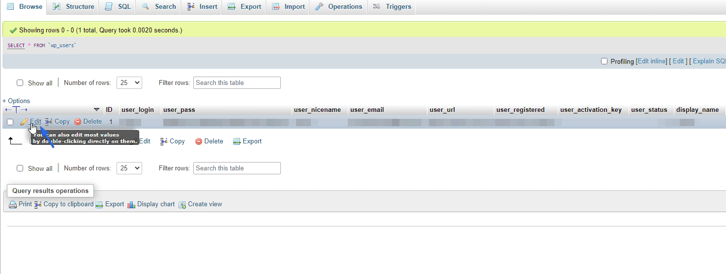 Stamtąd wybierz bazę danych swojej witryny WordPress, a następnie kliknij wiersz wp_users .