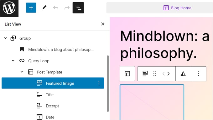 Jeśli chcesz skonfigurować konkretny blok znajdujący się w grupie, wierszu, kolumnie itp., po prostu kliknij ten blok w widoku listy. Stamtąd blok zostanie wybrany i pojawi się pasek narzędzi.