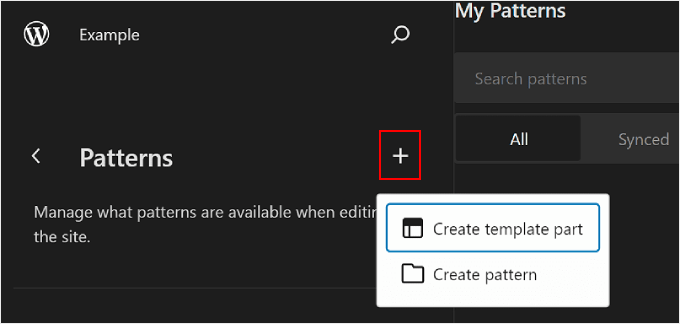 Aby dodać nowy wzór, kliknij przycisk „+ Utwórz wzór” w lewym panelu i wybierz pomiędzy utworzeniem nowego wzoru lub części szablonu.