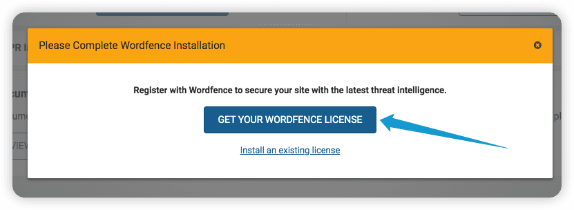 Następnie musisz dodać licencję na korzystanie z WordFence. Kliknij Uzyskaj licencję na WordFence, aby kontynuować.