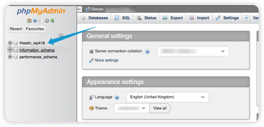 Zobaczysz swoją bazę danych MySQL WordPress. Nazwa jest różna dla różnych witryn. Ale często zawiera _wp . Kliknij na to.