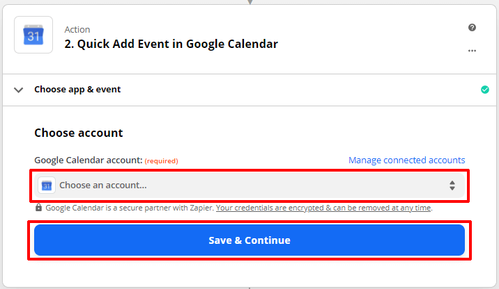 Wybierz konto Kalendarza Google, do którego chcesz dodać swoje wydarzenie. I naciśnij Zapisz i kontynuuj .