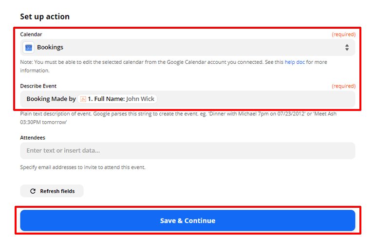 Czas rozpocząć akcję. Wybierz Kalendarz i opisz wydarzenie. Możesz wybrać wartość pola formularza rezerwacji, taką jak imię i nazwisko gościa, aby opisać wydarzenie. Na koniec naciśnij Zapisz i kontynuuj testowanie swojej akcji.