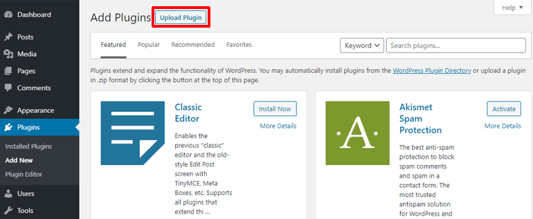 Następnie kliknij opcję Prześlij wtyczkę u góry strony.