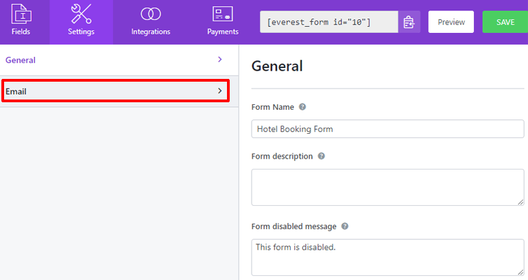 Przejdź do Everest Forms >> Wszystkie formy . Kliknij nazwę formularza rezerwacji online swojego hotelu. Następnie kliknij kartę Integracje na górnym pasku okna edytora formularzy.