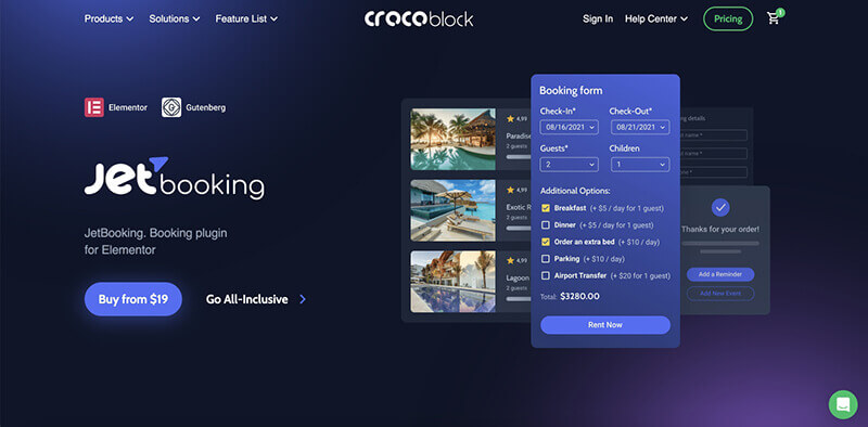 Wtyczka JetBooking to przydatna wtyczka firmy Crocoblock służąca do ustawiania ustawień silnika rezerwacji. Dzięki niemu możesz tworzyć własne posty opisujące Twoje usługi, łatwo zarządzać rezerwacjami i projektować wygodne formularze rezerwacji. Umożliwia tworzenie zaawansowanych formularzy z kalkulatorem, wyświetlanie dostępnych terminów i możliwość szybkiej płatności. W łatwy sposób możesz stworzyć formularz zapisów na konkretną godzinę lub ustawić odrębną cenę w zależności od okresu rezerwacji.